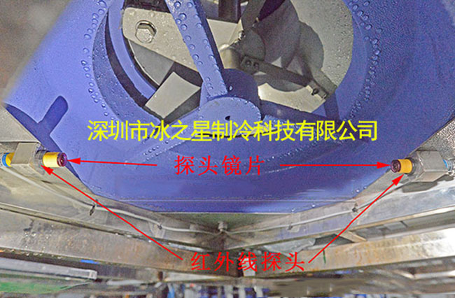 ⑵储冰柜冰未满但此灯亮,说明片冰机满冰探头出现故障。排除方法,检查满冰探头是否保持同一直线上(如下图),如发现不在同一直线上,请调整探头上下位置,直到保持在同一直线。如在同一直线但此报警灯仍未熄灭,请用布擦拭红外线探头镜片,如仍未排除故障,请更换满冰探头或联系生产厂家。