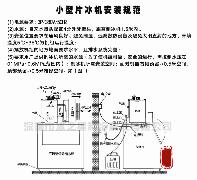 4、片冰机四周应当有足够的空间,特别是散热部分(冷凝器),要有足够的散热环境。