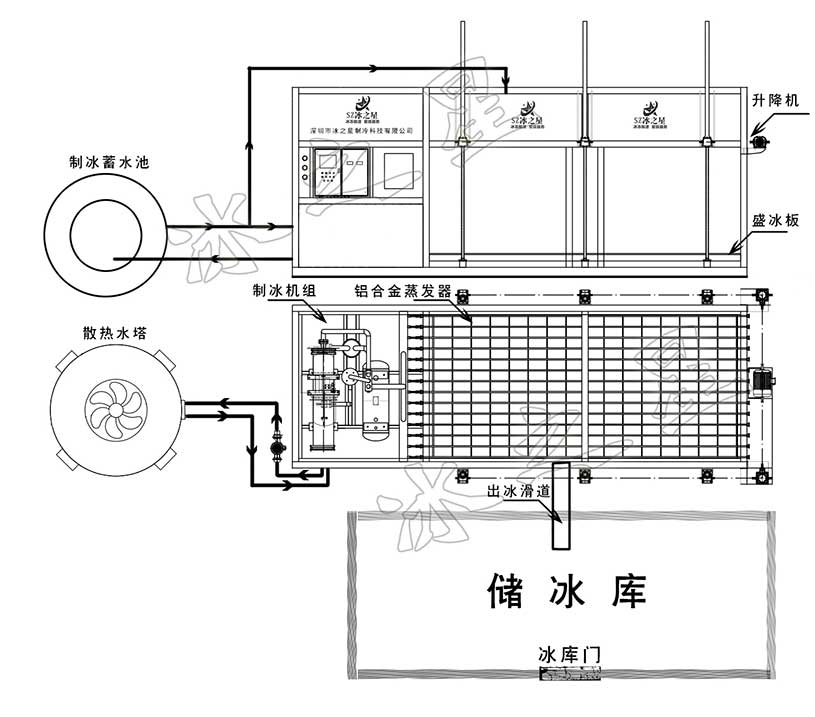 F、脱冰迅速快:水冻结成冰后,制冰系统反向加热,热氟进入蒸发器脱冰,脱冰速度快;脱冰后直接落在冰输送装置上,无需行车等取吊设备;